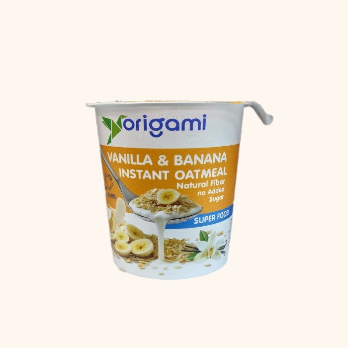 غلات صبحانه 55گرمی ORIGAMI Vanilla & banana - غلات صبحانه لیوانی بدون شکر اضافی با فیبر طبیعی حاوی موز خشک، پودر خرما و وانیل